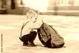 Happy smart kid in glasses is going to school for the first time. Child boy with bag go to elementary school. Child of primary school