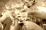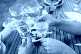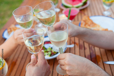 Family outdoor dinner in the garden in summer at sunset. Picnic food and drink concept