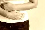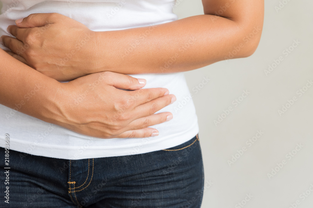 Young woman having painful stomachache. Chronic gastritis. Abdomen bloating concept.
