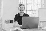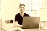 junger auszubildender sitzt im büro vor dem laptop