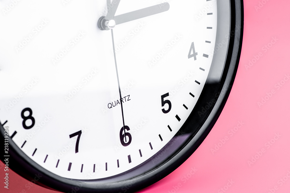 A pink wall clock on pink background Theme of Working business The concept of The time Copy space
