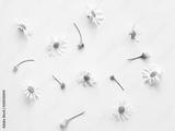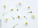 Chamomile flowers Top view Many flowers and buds of chamomile are lying on a white table Photo template in pastel colors