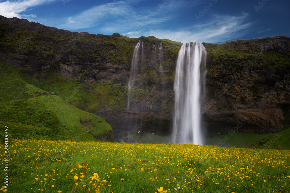 Skogafoss waterfall and yellow flower in summer ,Iceland.