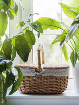 Vintage wicker basket on window sill with green plants