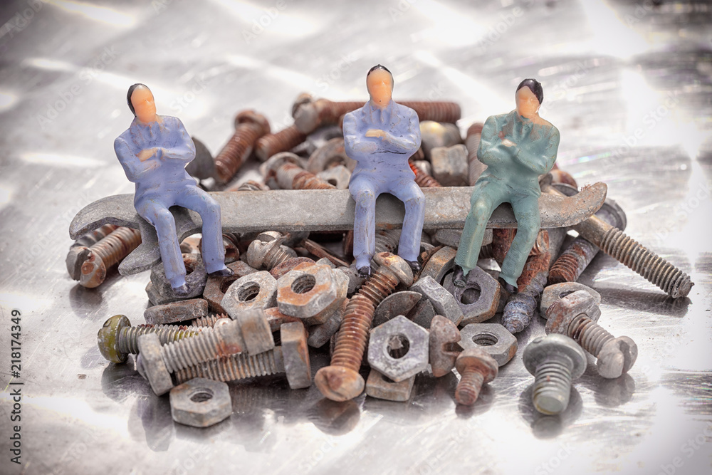 three businessman miniature people toys sittiong on a wrench and heap of old rusty nuts and screws, business meeting concept.