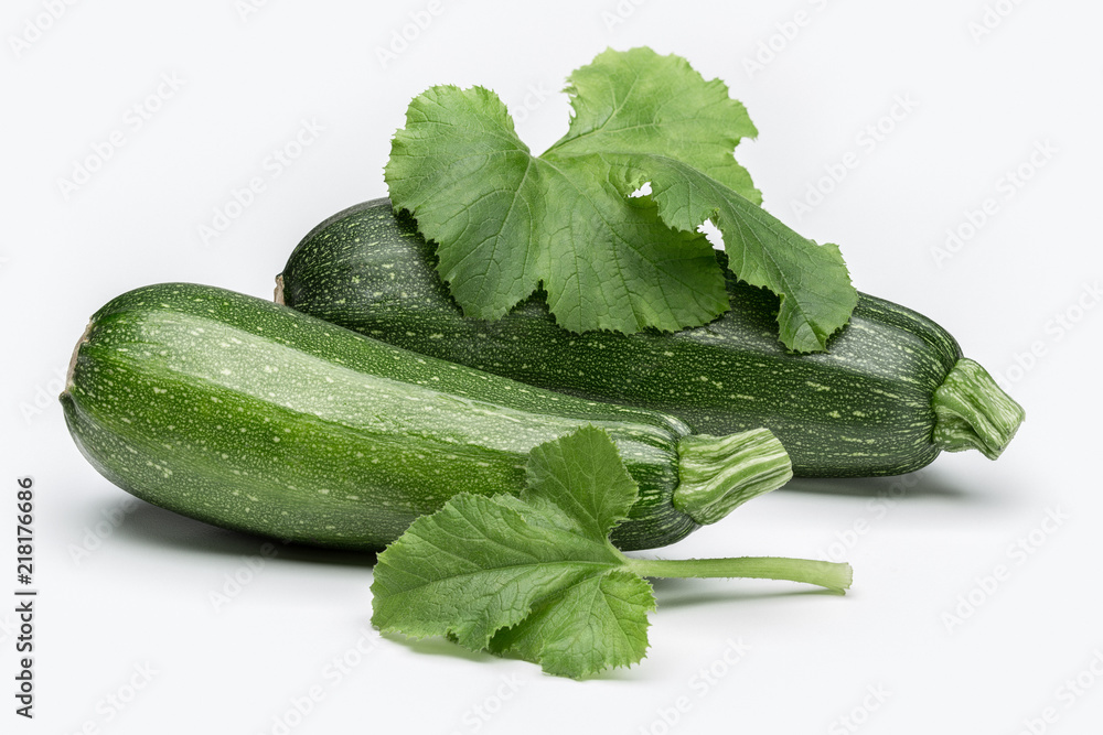 Ripe zucchini on white background with green leaf