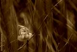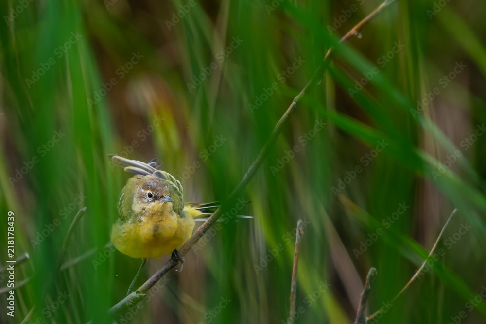 Yellow wagtail on a young branch, in the wind and against the background of a green field