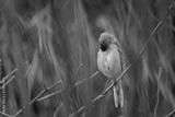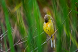 Yellow wagtail on a young branch, in the wind and against the background of a green field