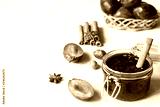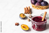 Homemade plum jam with spices (anise, cinnamon) and fresh plum on a white background.