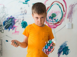 A little boy of 5 years with a guilty look painted with paint and brush on the wall of his room. Naughty child, angry baby