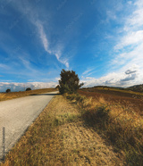 Beautiful view of summer countryside landscape, blue sky with clouds and fields