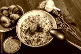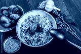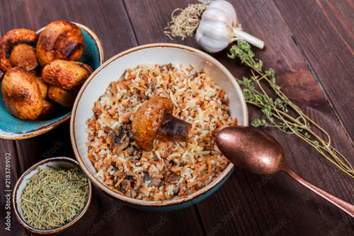 Fried noodles with rice and baked mushrooms on plate on wooden background. Healthy food. Top view