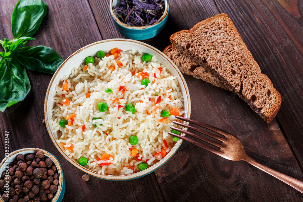 Rice with vegetables, peas, carrots, peppers on plate on wooden background. Healthy food. Top view