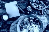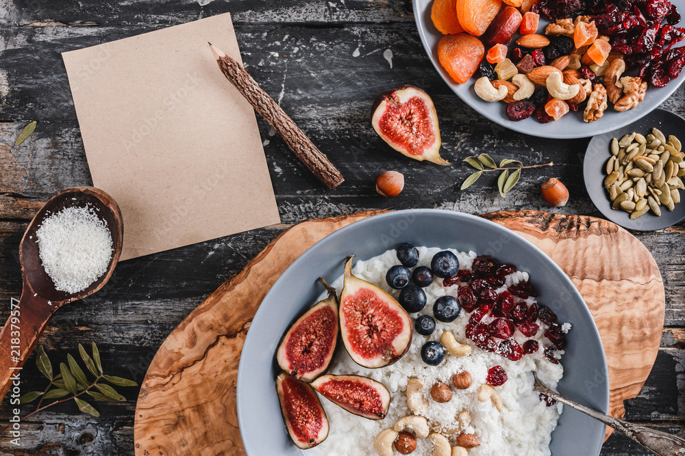Rice coconut porridge with figs, berries, nuts, dried apricots and coconut milk in plate on rustic wooden background. Healthy breakfast ingredients. Clean eating, vegan food concept. Top view