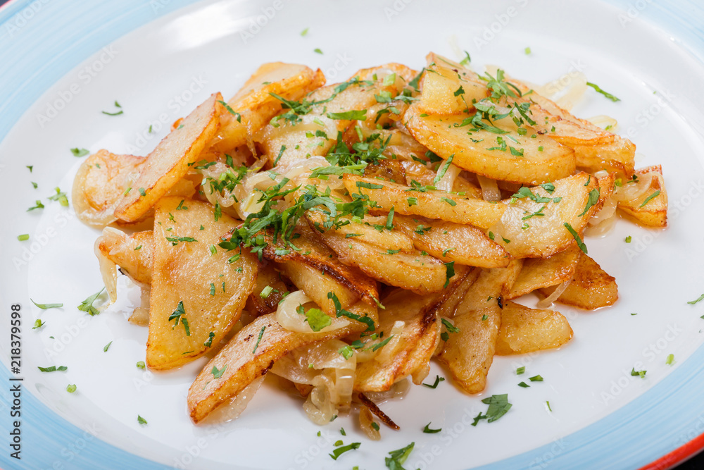 Roasted potato with herbs on plate on dark wooden background with fork, homemade food. Top view