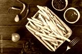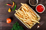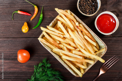 Baked Potato Fries with Ketchup and spices on dark wooden background. Italian dish
