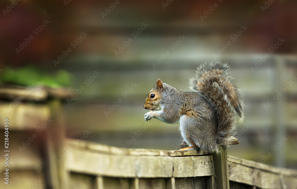 Grey squirrel sitting on a wooden fence and eating nut
