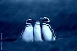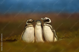Magellanic penguins with a juvenile standing near a burrow