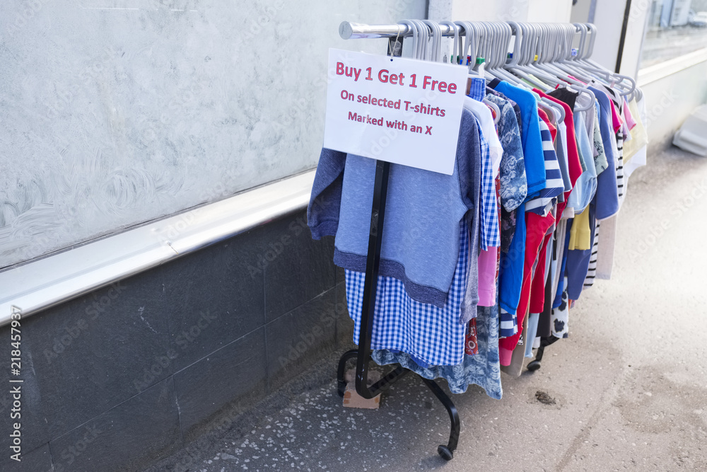Buy 1 get 1 free sign outside clothes shop with rail of t-shirts and tops