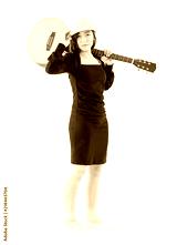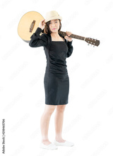 Woman carrying acoustic guitar on shoulder