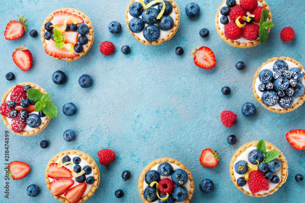 Tasty berry tartlets or cake with cream cheese and different berries around. Pastry dessert top view.