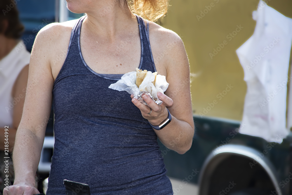 Closeup of unrecognizable girl in sleveless teeshirt with exercise wristband eating food from food truck outdoors