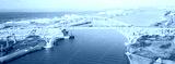Panorama aerial view of Corpus Christi Harbor Bridge with row of oil tanks and wind turbines farm in distance. A through arch bridge crosses the Corpus Christi Ship Channel