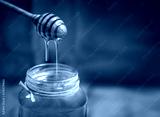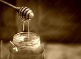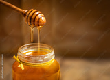 Honey in a glass jar with honey dipper on rustic wooden table background. Copy space.