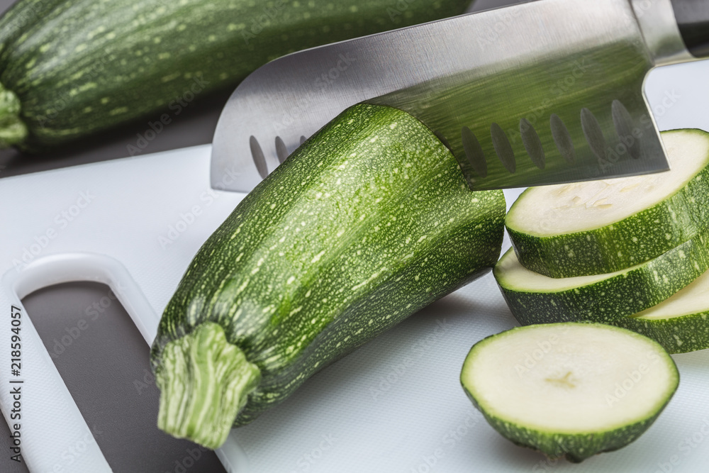 Cutting fresh squash ( zucchini) with large kitchen knife.
