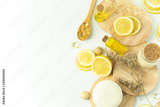 lemonade with cosmetic spa soap oil mockup in beauty skincare treatment healthy concept, top view of nutrition lemon for facial