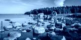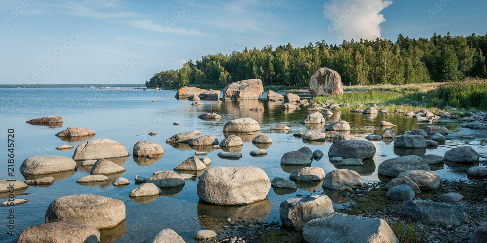 Boulders on the Gulf of Finland shore near Kasmu village in northern Estonia. Classic Baltic seascape. Sunny. Copy space. Panoramic view.
