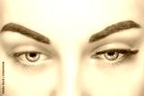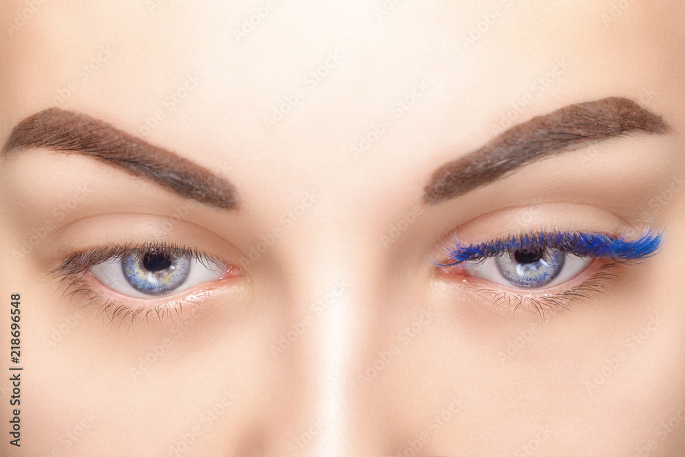 Eyelash Extension Procedure. Woman Eye with Long Blue Eyelashes. Ombre effect. Close up, selective focus.