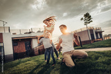 Full length portrait of optimistic lady flourishing hair while dancing with smiling little female child. Laughing husband situating near them outdoor. They locating on grass near house