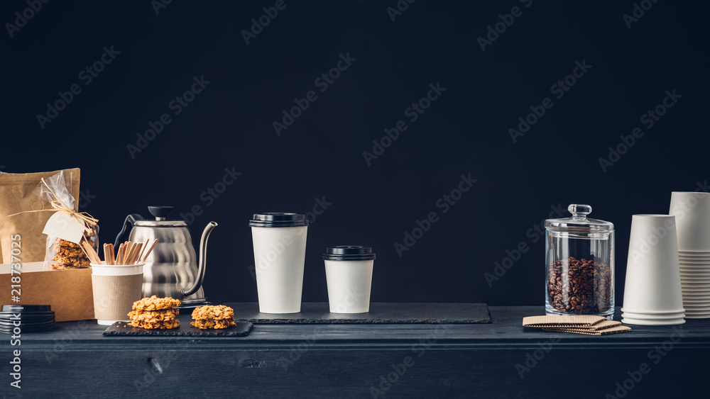 Coffee shop interior, Coffee to go and accessories on the table