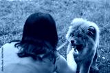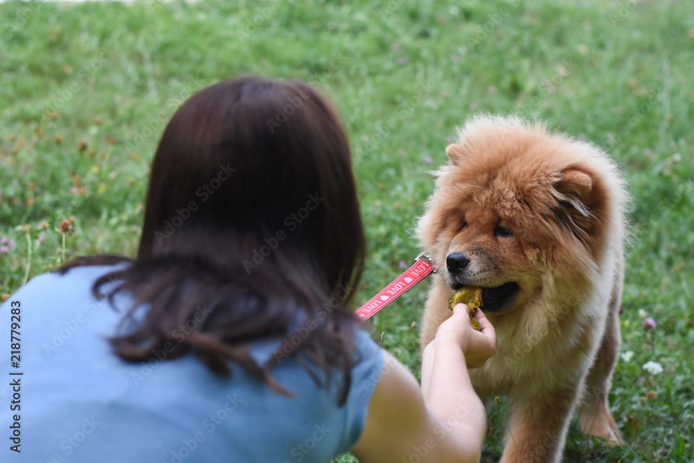 Woman feeding chow chow dog with plum. Woman give plum to her dog