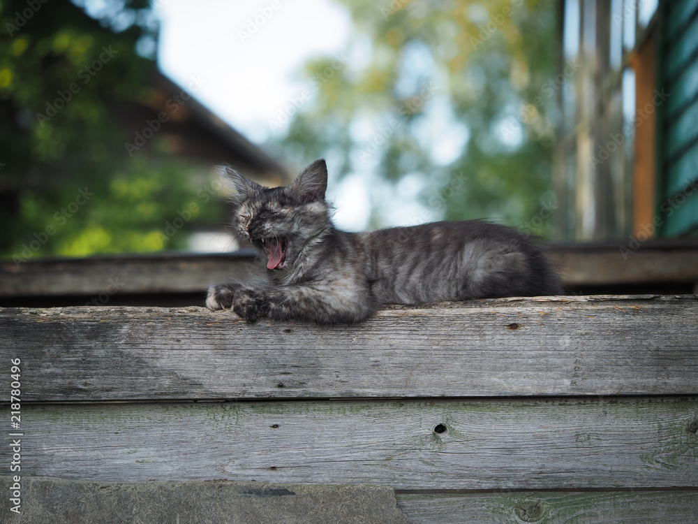 Cute kitten yawns. Porch of an old house, beautiful nature background