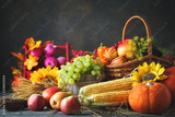 Happy Thanksgiving Day background, wooden table decorated with Pumpkins, Maize, fruits and autumn leaves. Harvest festival. Selective focus. Horizontal. Background with copy space.