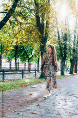 Young woman in sunglasses walking in autumn park with little puppy. Outdoor lifestyle portrait of pretty smiling female and her small dog.