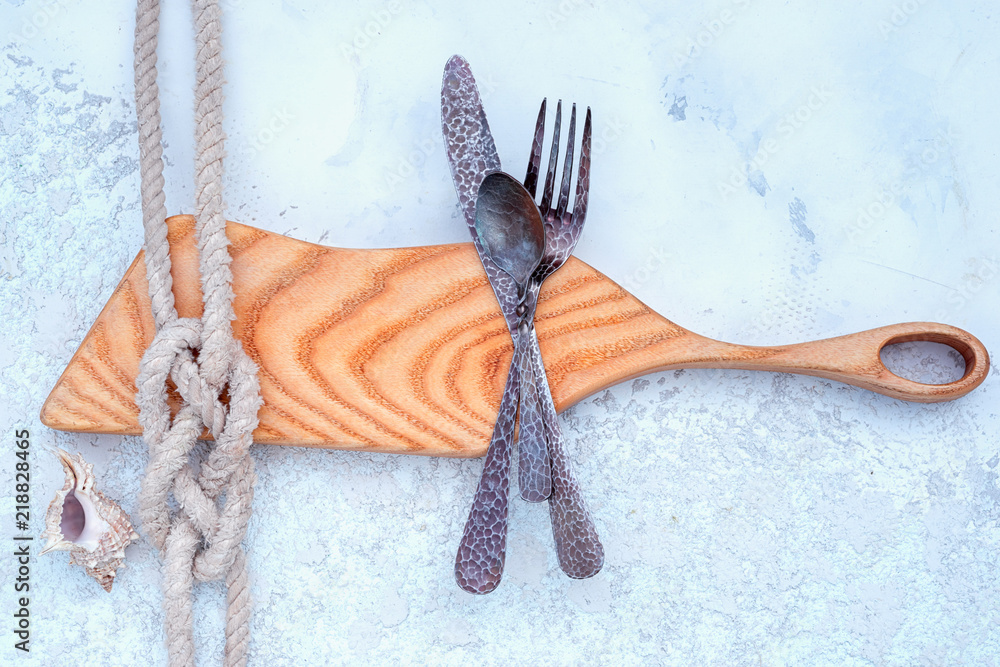 cutting board, seashell and rope knot on a textured concrete background with cultery, top view with copy space template for your seafood menu design.