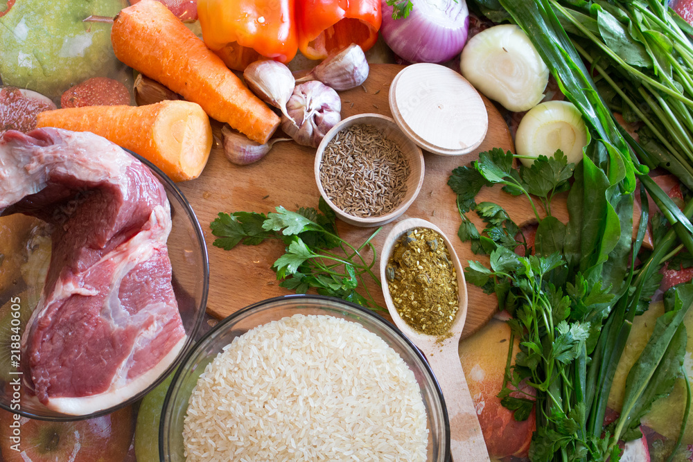products for cooking pilaf meat with rice on fire in cauldron