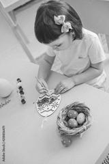 child paints eggs on wooden workpiece eggs sitting at table in a white room