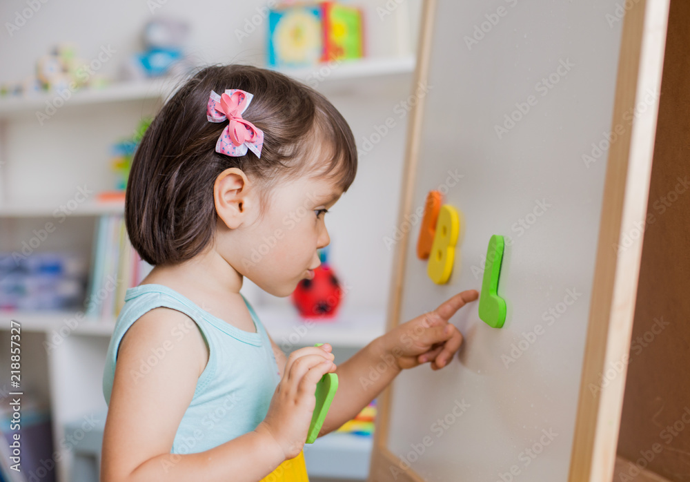 Preschool girl studying the letters of the alphabet. Child reaching up at the Board with bright letters in a white and bright room. Early development. Preparation for school.