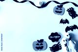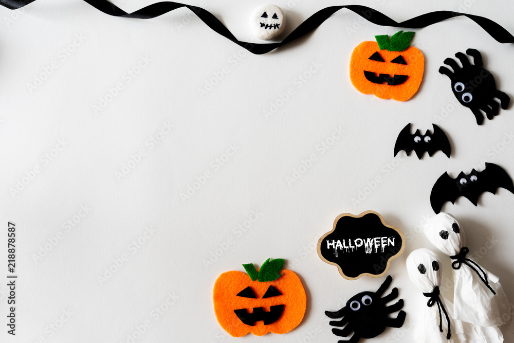 Top view of Halloween crafts, orange pumpkin, ghost and spide on white background with copy space for text. halloween concept.