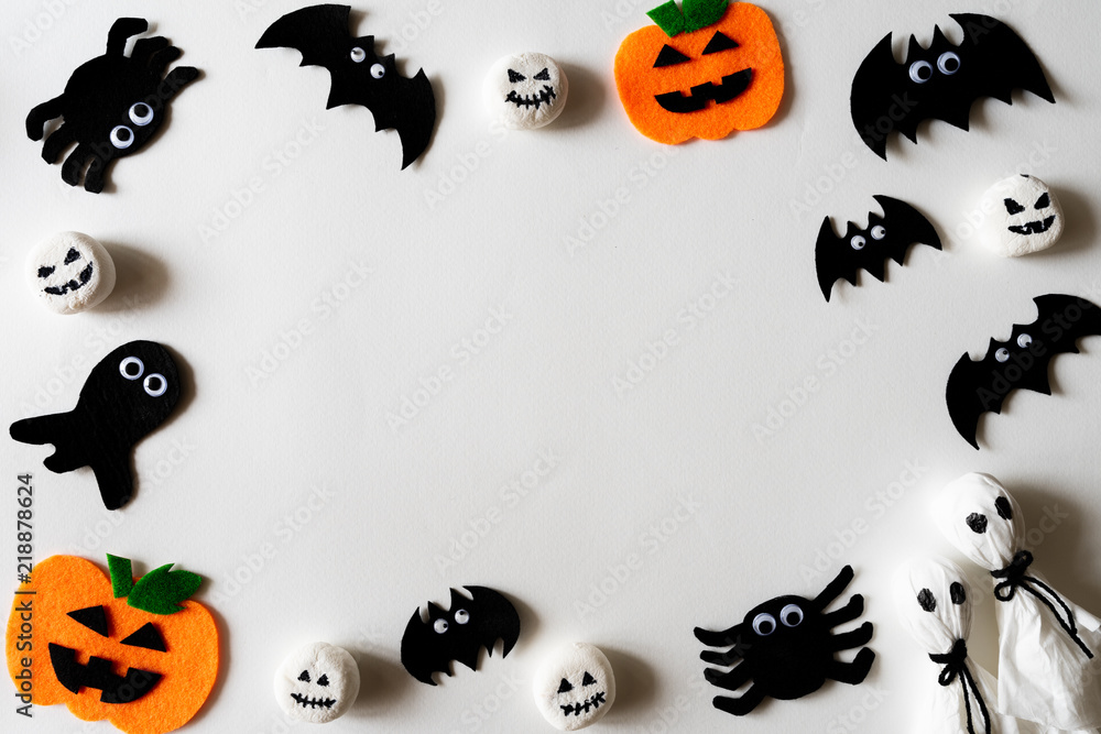 Top view of Halloween crafts, orange pumpkin, ghost and spide on white background with copy space for text. halloween concept.