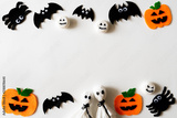 Top view of Halloween crafts, orange pumpkin, ghost and spide on white background with copy space for text. halloween concept.
