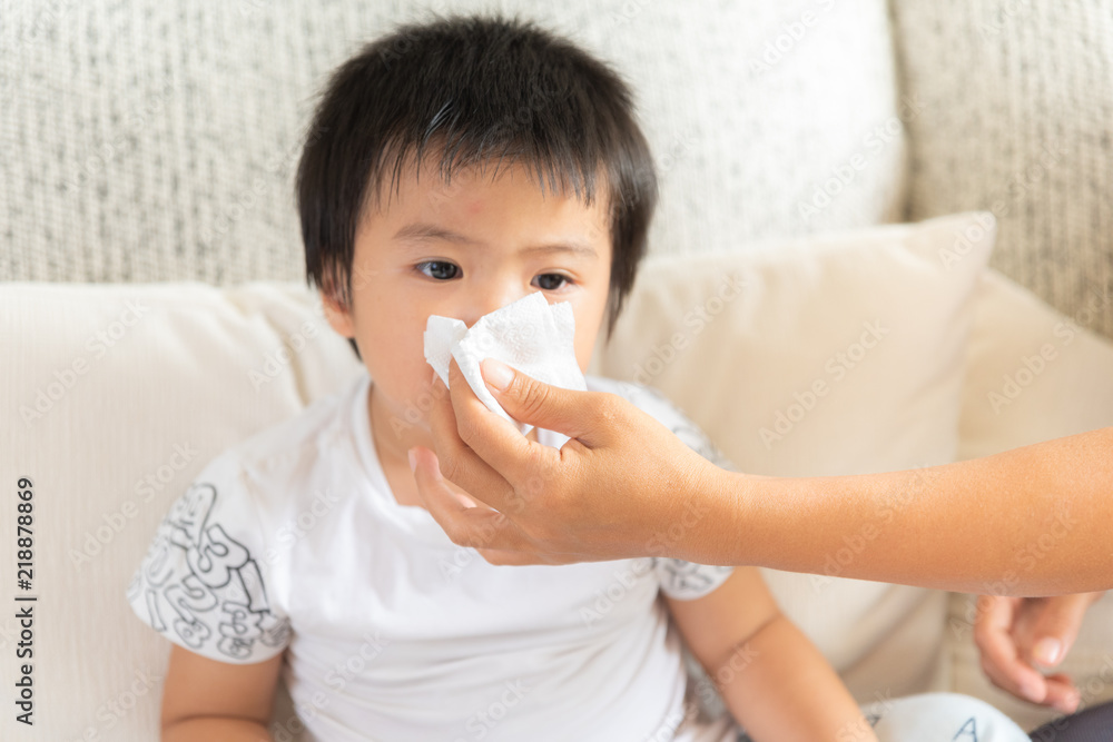 Mother helping daughter blow her nose at home in the living room. Medicine and health care concept.
