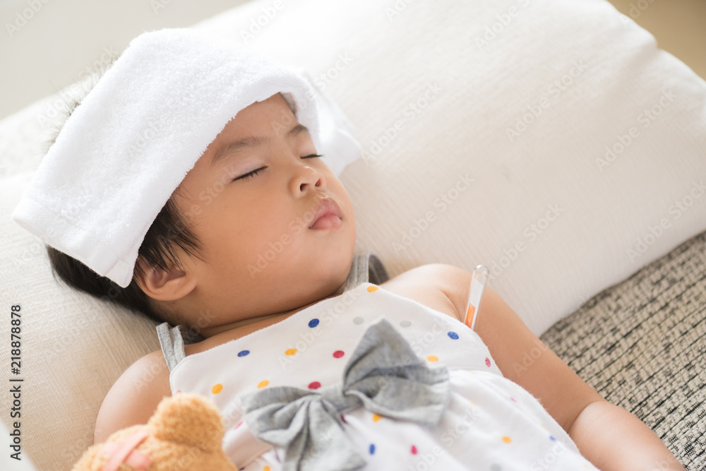 Young little girl sleeping and sick on the sofa with cooler gel on her head and measuring temperature by thermometer. and take care by her mom.