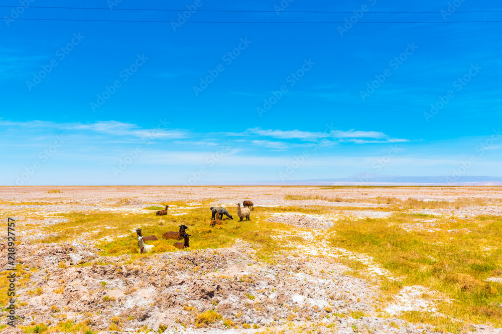 A flock of Lamas in the Atacama desert, South America, Chile. Copy space for text.