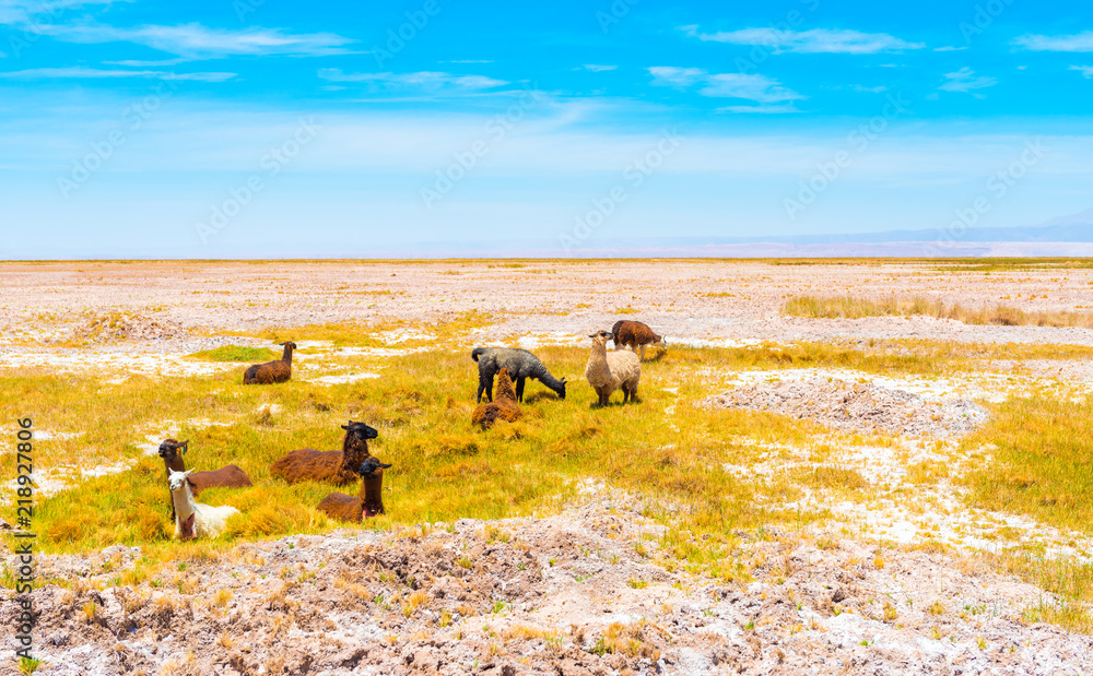 A flock of Lamas in the Atacama desert, South America, Chile. Copy space for text.