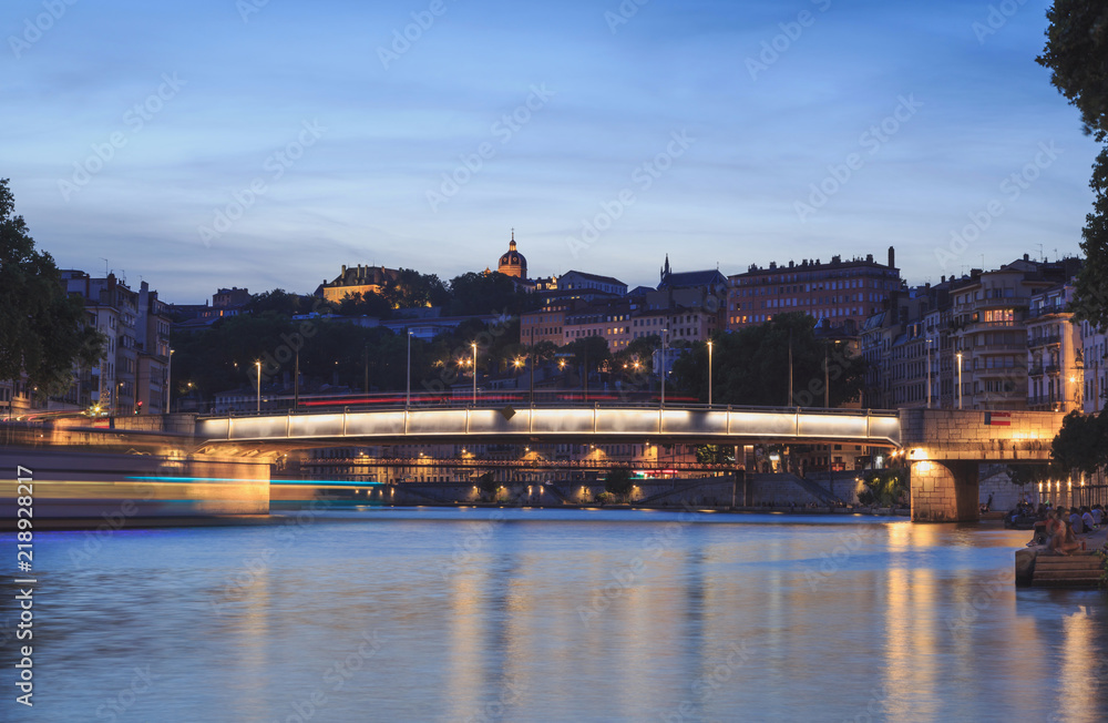 Light trails during a beautiful dusk at the shore of the Saone river in Lyon. France.